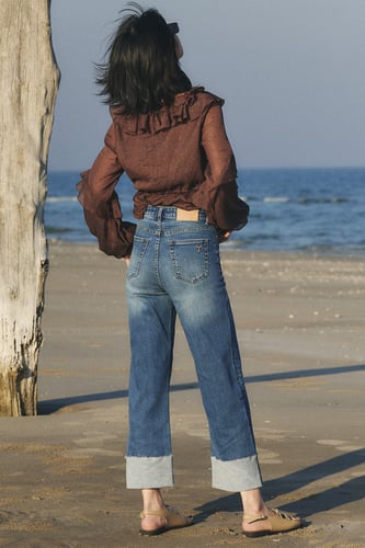 กางเกงยีนส์ทรงกระบอก ดีไซน์พิเศษที่ปลายขาพับ ดีเทลแบะตะเข็บสวยงามด้วยเทคนิคการเย็บอย่างประณีต