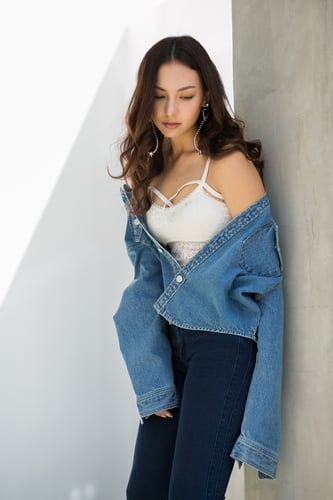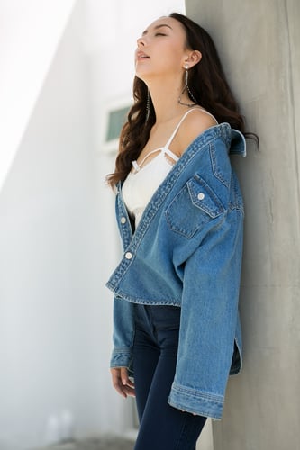 แจ๊คเก็ตยีนส์ผ้าไม่ยืดแบบด้านหน้าสั้นด้านหลังยาว
